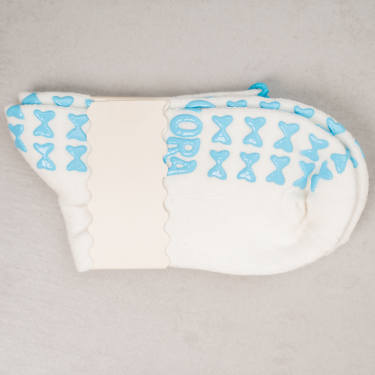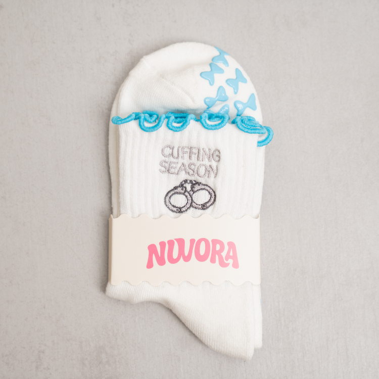 Baby blue and cream ankle sock with baby blue ruffles, text: Cuffing season in silver italics with cuff symbol. Blue bow grips, Nuvora logo in middle.