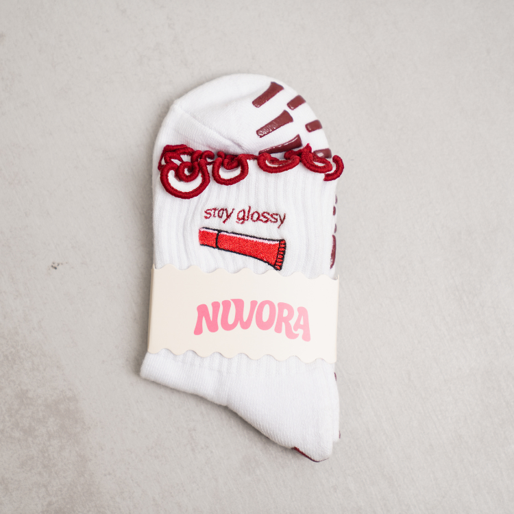 Cream ankle sock with burgundy ruffles. Writing: Stay glossy with a lip gloss symbol. Grips: lip gloss design with Nuvora logo.