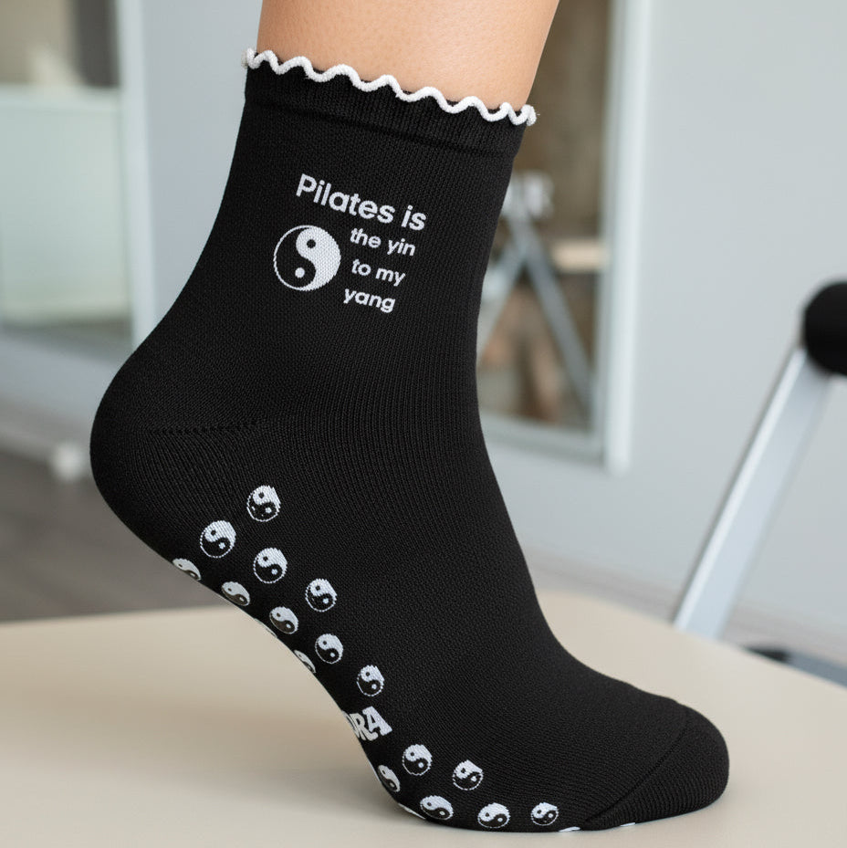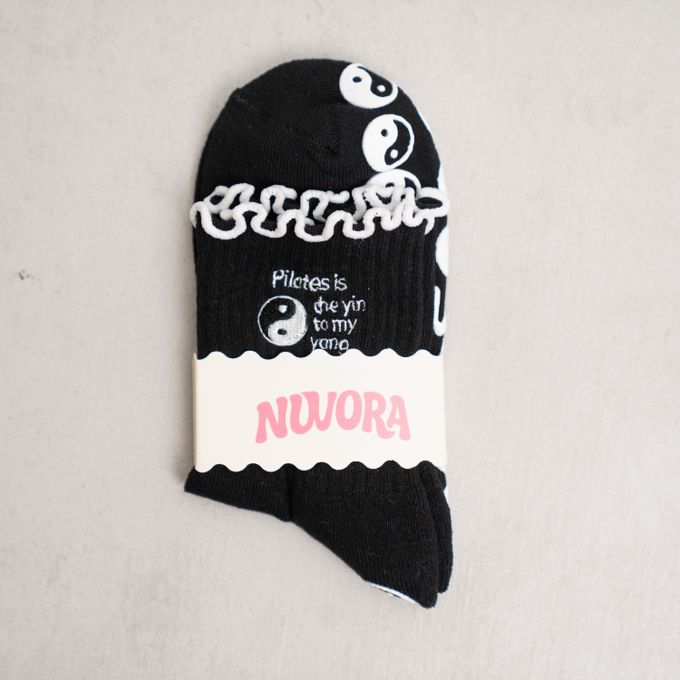 Black socks with white ruffles and yin-yang symbol, text: Pilates is the yin to my yang. Yin-yang grips with Nuvora logo.
